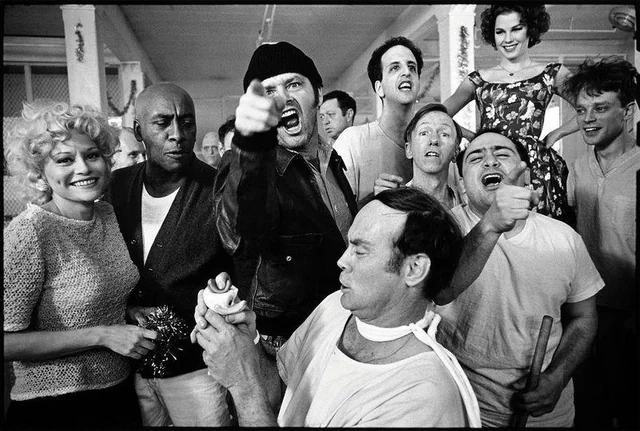 Взгляните на Джека Николсона на съемках One Flew Over the Cuckoo´s Nest (1975). Он здесь выглядит самым нормальным человеком в комнате, что само по себе иронично. Кстати, многие статисты были настоящими пациентами клиники. Милош Форман знал толк в погружении в среду, ничего не скажешь.